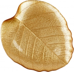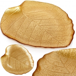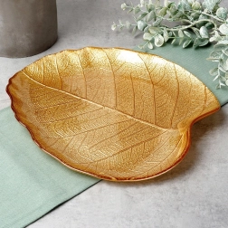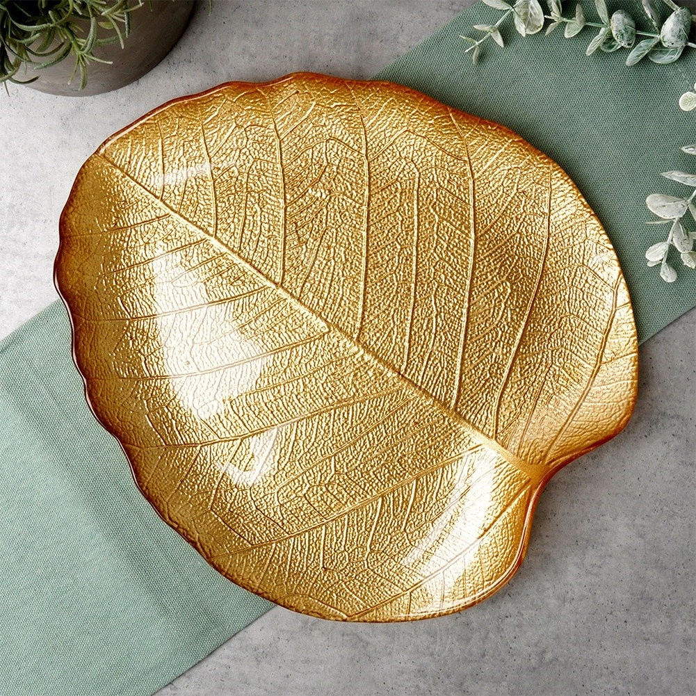 Wprowadź na stół szczyptę natury w premiumowym wydaniu. Szklany talerz w kształcie liścia zachwyca złotym połyskiem i detaliczną teksturą żyłek, która dodaje autentycznego, eleganckiego wyglądu. Perfekcyjny na co dzień i na uroczyste okazje.