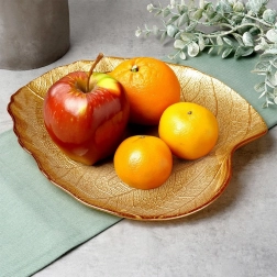 Elegancki talerz do serwowania w kształcie liścia ze szkła z złotym wykończeniem. Dzięki plastcznej strukturze żyłek wygląda luksusowo i stanie się dekoracyjną dominantą na stole. Idealny do serwowania deserów i przekąsek, ale także jako stylowa miska odkładcza na biżuterię lub taca pod świece. Wymiary 27,5 × 24 × 2,5 cm.