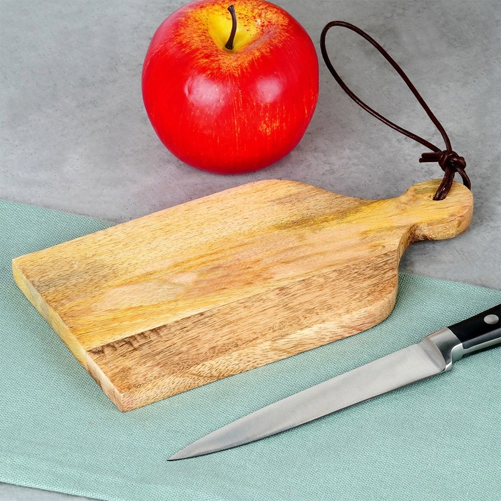 Elegancka i wszechstronna deska o wymiarach 19,5 × 10 × 1,5 cm pasuje do każdej kuchni i na odświętny stół. Naturalne drewno mango nadaje desce wysoką wytrzymałość, długą żywotność i wyjątkową kolorystykę usłojenia. Dzięki kompaktowemu rozmiarowi sprawdzi się zarówno podczas przygotowywania drobniejszych składników, jak i przy stylowym serwowaniu.