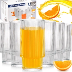 Elegancki zestaw sześciu wysokich szklanek o pojemności 320 ml z wysokiej jakości, ryflowanego szkła. Oferują pewny chwyt, nowoczesny wygląd i wszechstronne zastosowanie do wody, lemoniad, soków, drinków i mrożonych herbat. Można myć w zmywarce, idealne do domu, restauracji i baru.