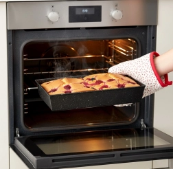 Trwała granitowa powierzchnia zapobiega przywieraniu i umożliwia łatwe wyjmowanie wypieków oraz dań zapiekanych, a także ułatwia czyszczenie.