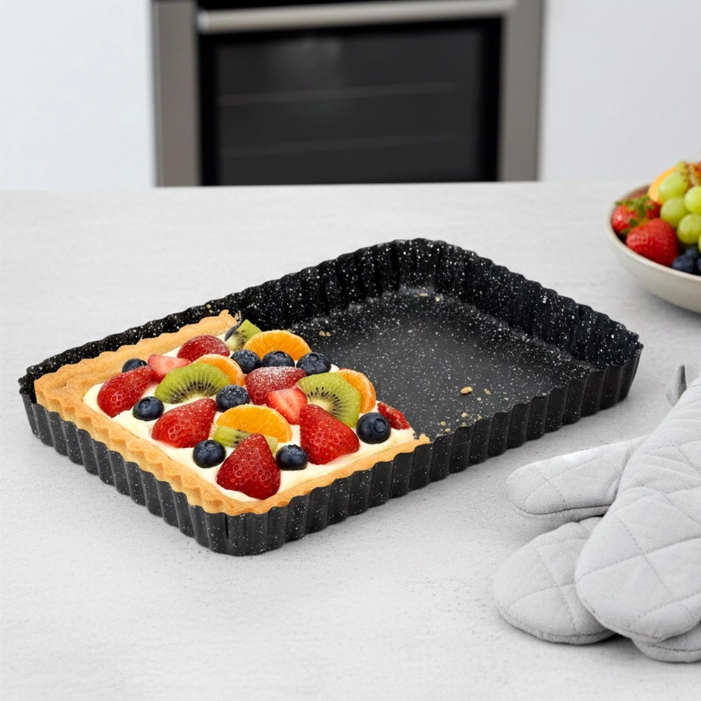 Prostokątna forma z karbowanym brzegiem i wyjmowanym dnem to świetny wybór do codziennego i odświętnego pieczenia. Dzięki wysokiej jakości stali węglowej z granitową powłoką doskonale przewodzi ciepło i pomaga osiągnąć idealny, równomierny rezultat bez przypalania.