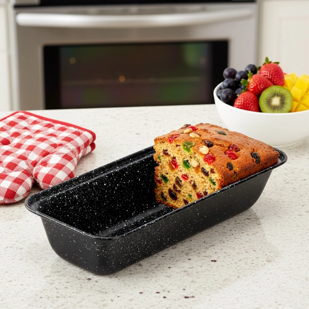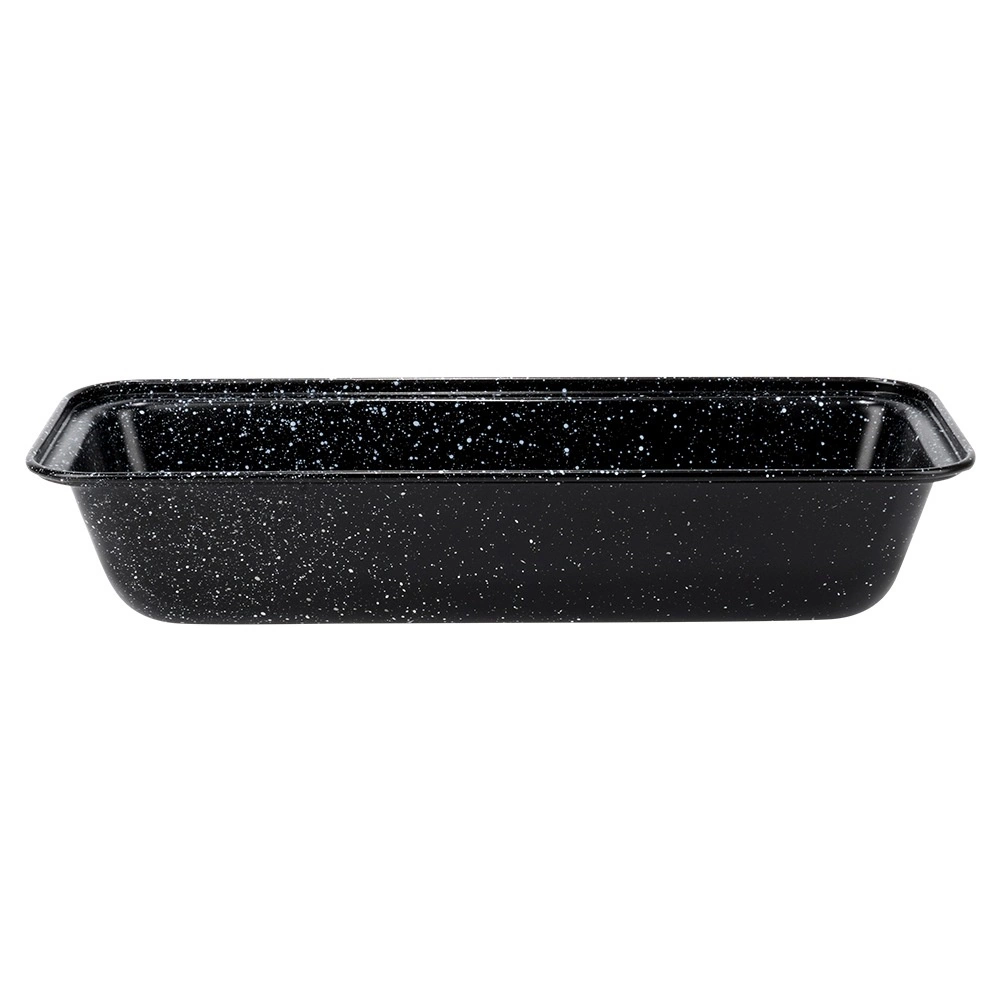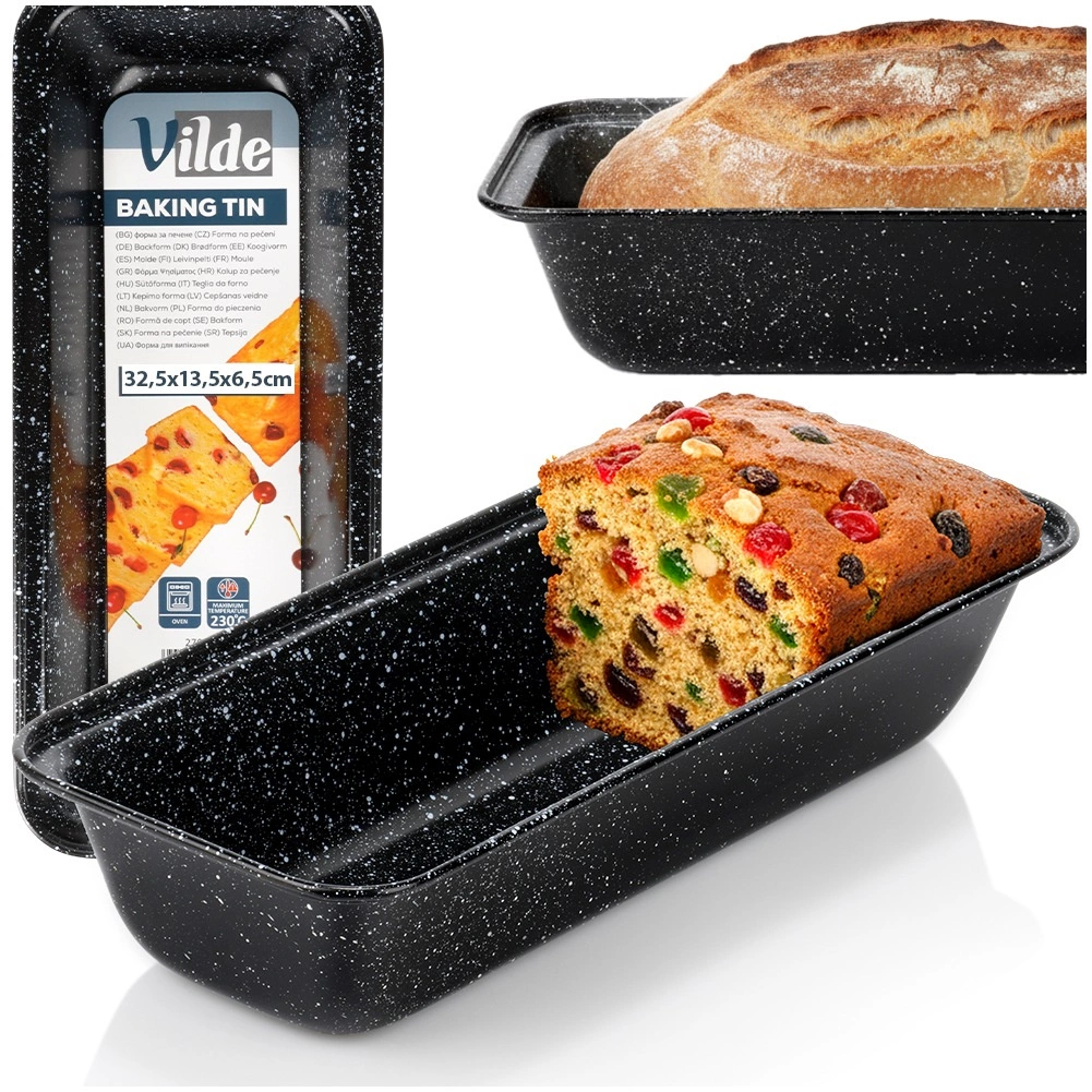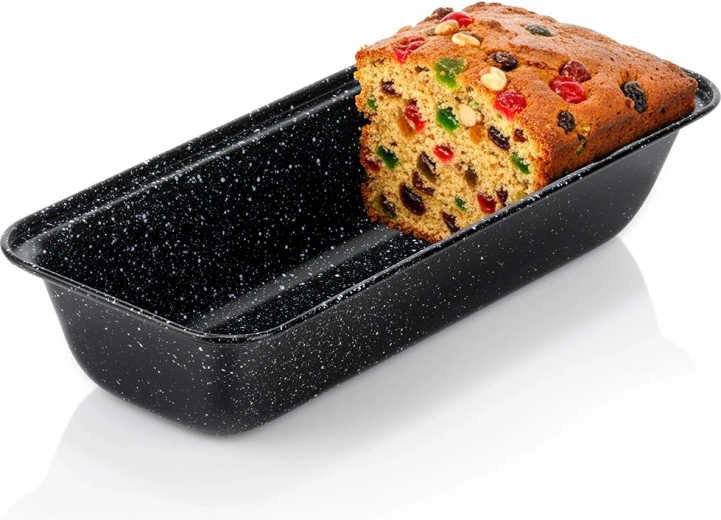 Praktyczna granitowa forma do pieczenia o wymiarach 32,5 × 13,5 × 6,5 cm do domowego chleba, keksów, babek i pasztetów. Wykonana z wytrzymałej stali węglowej z nieprzywierającą granitową powłoką dla łatwego wyjmowania, równomiernego wypieku i szybkiego czyszczenia. Odpowiednia do piekarników gazowych i elektrycznych do 230 °C.