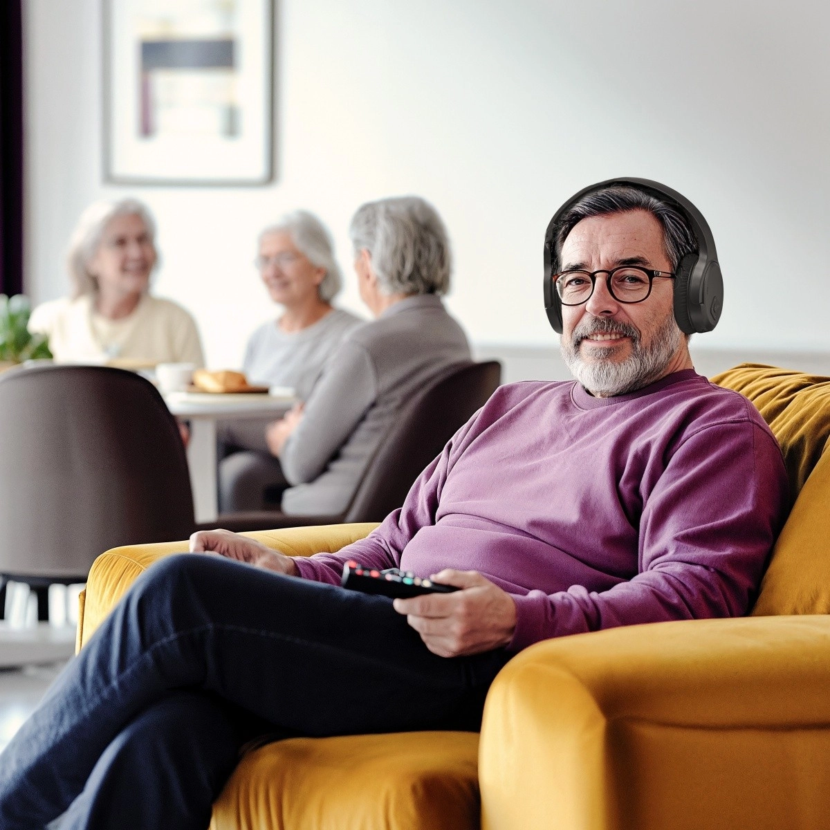 Bezprzewodowe słuchawki do telewizora oferują czysty i zsynchronizowany dźwięk dzięki transmisji 2,4 GHz bez opóźnień. Wystarczy podłączyć klucz USB-A do TV, a słuchawki połączą się automatycznie. Zamknięta konstrukcja nauszna z pasywną redukcją hałasu izoluje dźwięki otoczenia, zapewniając niezakłócony odsłuch.