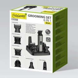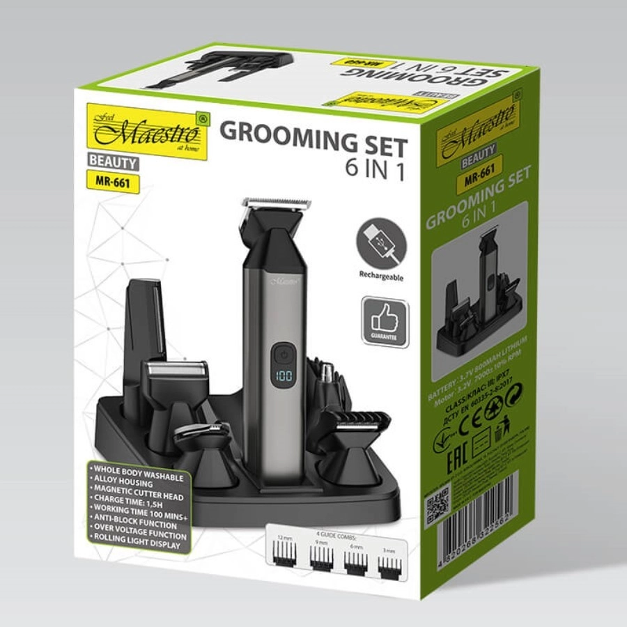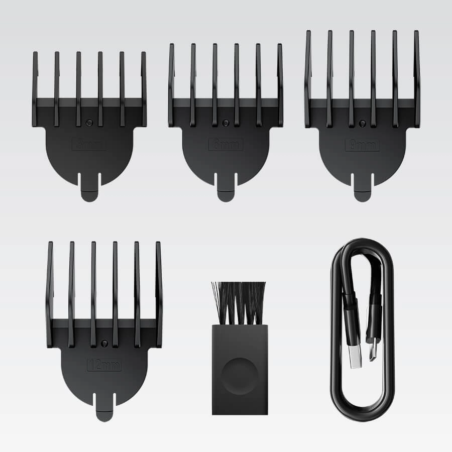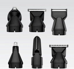 - Wielofunkcja 6w1 – nasadki do strzyżenia włosów, pielęgnacji zarostu i detali.