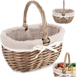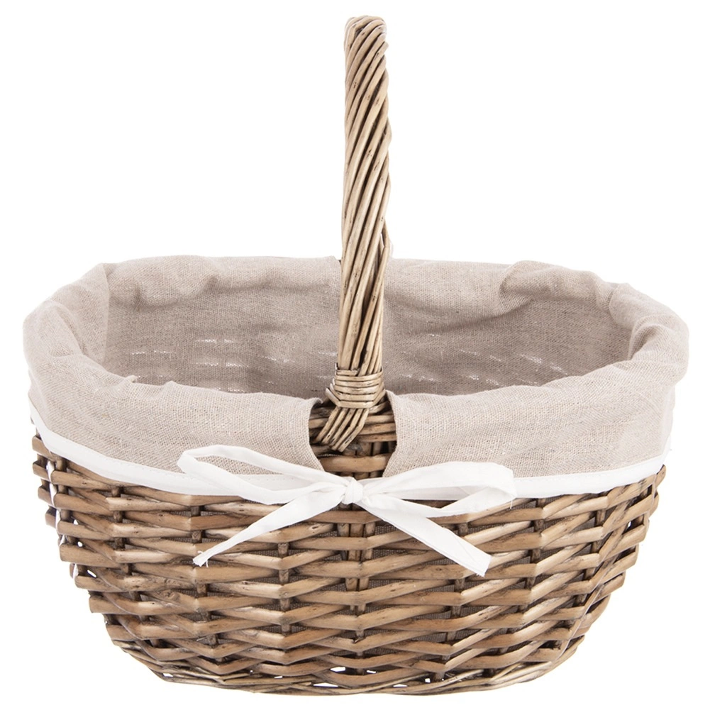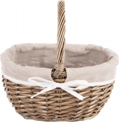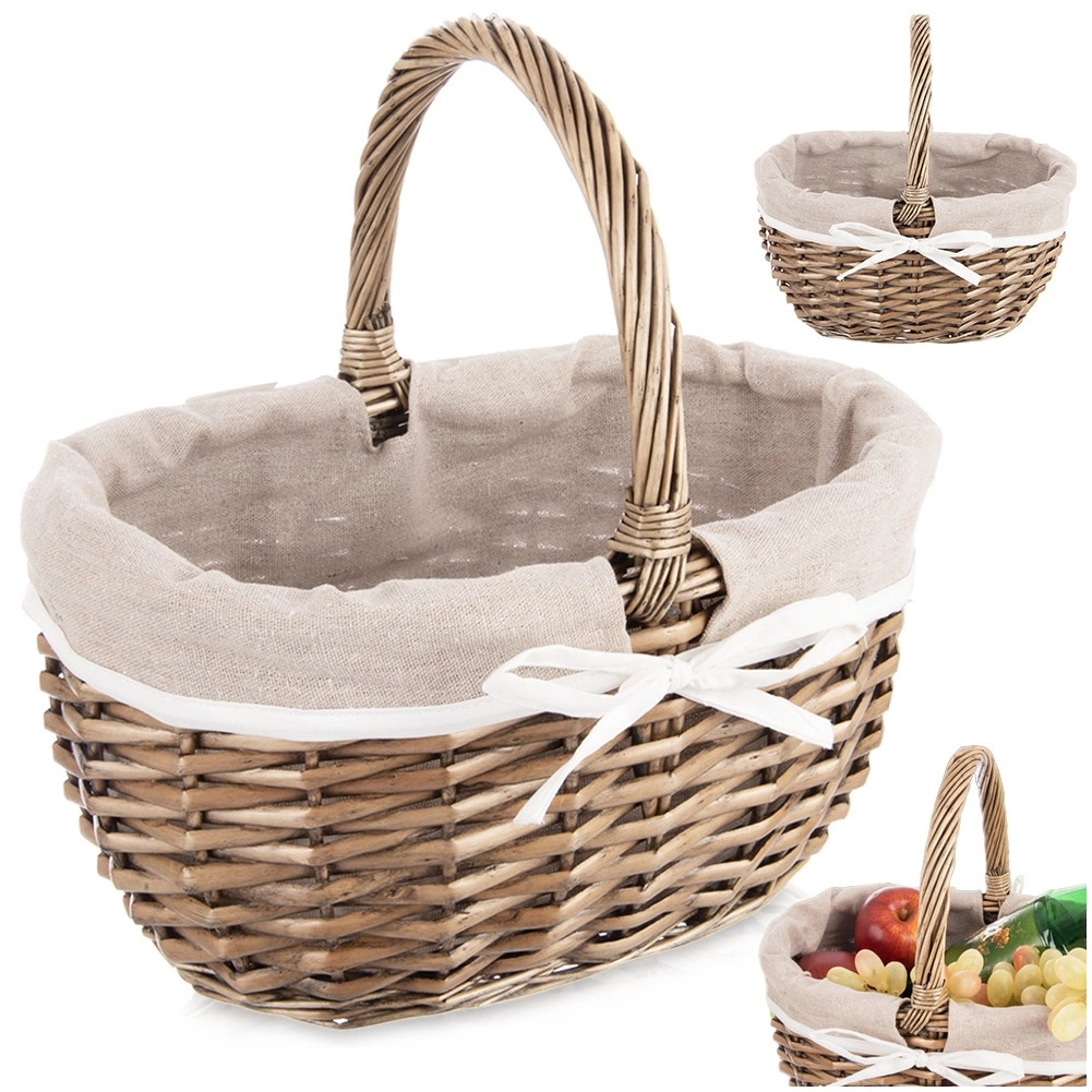 Elegancki wiklinowy kosz z solidnym uchwytem i wyjmowaną materiałową wkładką jest idealny na piknik, zakupy oraz do domowego przechowywania. Ręcznie pleciona naturalna wiklina gwarantuje trwałość i niepowtarzalny wygląd, a beżowa podszewka tekstylna z białą wstążką dodaje koszowi uroku i można ją łatwo wyprać. Praktyczne wymiary 32,5 × 24 × 32 cm ułatwiają przenoszenie i organizację rzeczy.