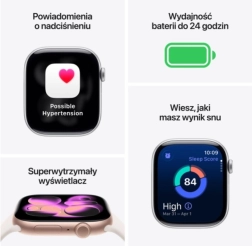 Trening i wydajność: Ulepszona apka Trening oferuje tempo bazowe, wyścig na trasie i własne treningi, precyzyjny GPS i podgląd obciążenia treningowego. Dzięki Apple Music i inteligentnym powiadomieniom motywacja i rytm są zawsze pod ręką. Z Cellular możesz dzwonić, pisać i płacić Apple Pay także bez iPhone’a.