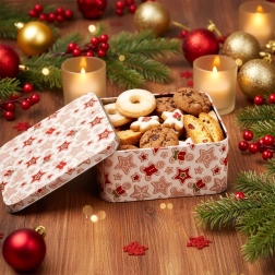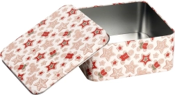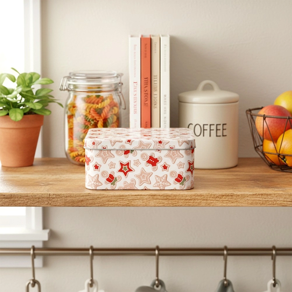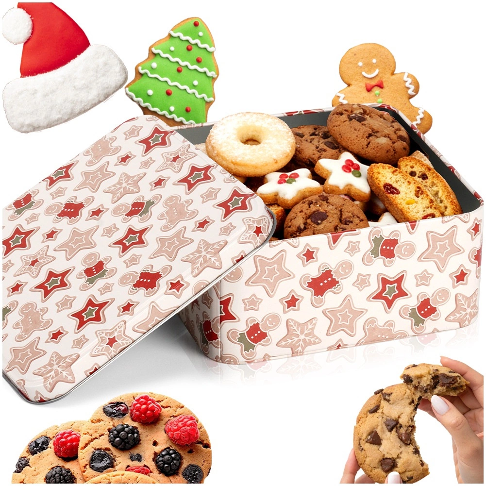 Ta kwadratowa metalowa puszka z subtelnym świątecznym wzorem pierniczków, gwiazdek i zimowych motywów świetnie sprawdzi się na co dzień i sezonowo. Dzięki solidnej pokrywce pomaga utrzymać przechowywane smakołyki dłużej świeże i chronione.