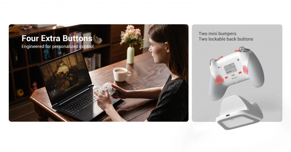 Do rozgrywek kompetytywnych przygotowano optyczne mikrowyłączniki ABXY, precyzyjny mechaniczny D‑pad, parę minibumperów R5/L5 oraz dwa programowalne tylne przyciski R4/L4 z blokadą przed przypadkowymi naciśnięciami. Cztery silniki wibracyjne w spustach i uchwytach zapewniają immersyjną haptykę, a wymienny magnetyczny trójdzielny panel umożliwia personalizację.