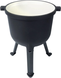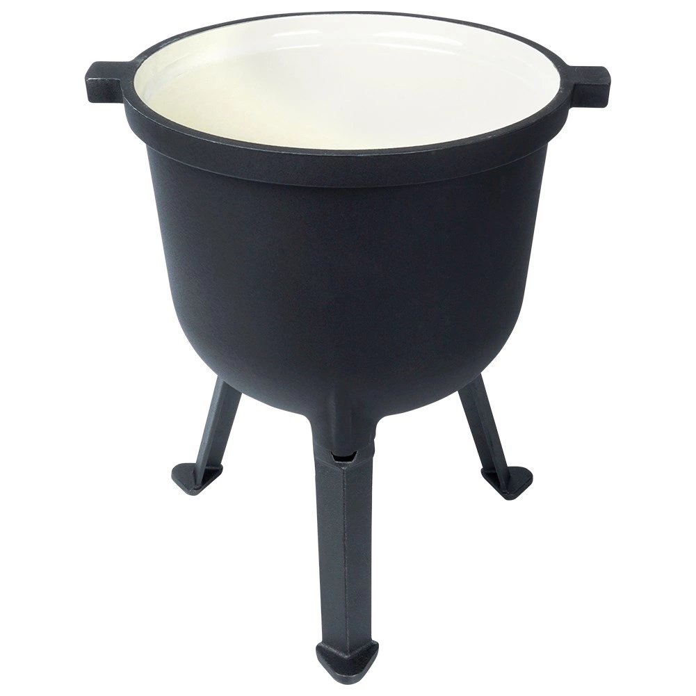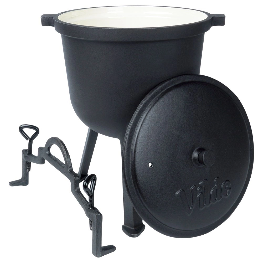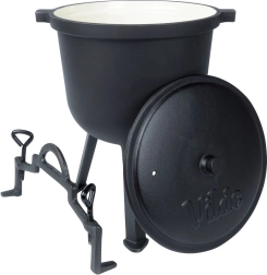 Kociołek VILDE z linii CAST LINE wykonany jest z czarnego żeliwa z gładką, nieporowatą, beżową emalią wewnątrz. Jest ona odporna, niereaktywna i pomaga zapobiegać przypalaniu potraw. Trzy solidne nogi zapewniają stabilność nad paleniskiem, a pokrywka z otworem wentylacyjnym i możliwością dociągnięcia dwoma śrubami utrzymuje ciepło i soki wewnątrz.