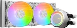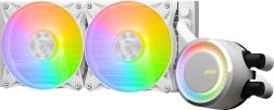 Zamknięta pętla z wytrzymałą trójfazową pompą minimalizuje wibracje i hałas, a rozdzielony wewnętrzny przepływ w radiatorze pomaga szybciej rozpraszać ciepło. Dwa 120‑mm wentylatory ARGB oferują mocny przepływ powietrza i można je łatwo zgrać z Twoim zestawem dzięki sterowaniu przez MSI Center.