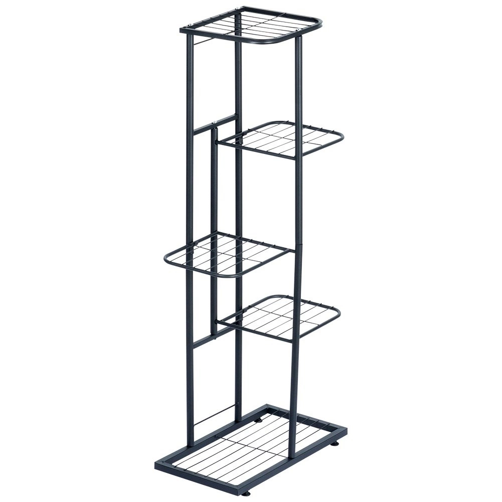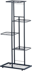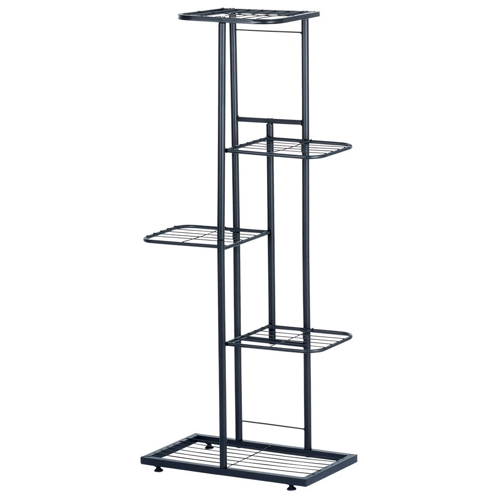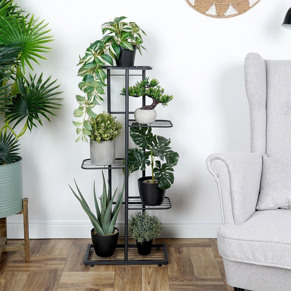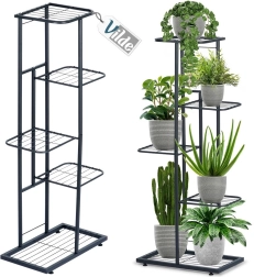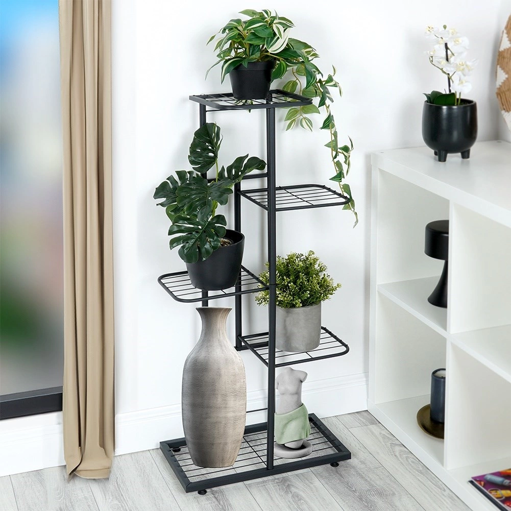 Ten elegancki metalowy regał na kwiaty o wysokości 96 cm oferuje pięć oddzielnych półek do przejrzystej i efektownej aranżacji roślin doniczkowych, kaktusów, pnączy oraz dekoracji. Matowa czerń w industrialnym stylu loft z łatwością wpasuje się w nowoczesny salon, przedpokój, biuro, a także na zadaszony balkon.