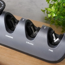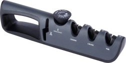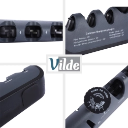 Stopnie Coarse, Crude i Fine (ceramika) odnawiają i polerują krawędź; oddzielna diamentowa szczelina precyzyjnie ostrzy nożyczki.