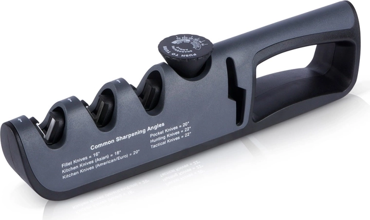 Pokrętło pozwala ustawić idealny kąt dla noży kuchennych (14–20°), EDC i składanych (20–22°) oraz bardziej masywnych ostrzy outdoorowych i myśliwskich (22–24°).