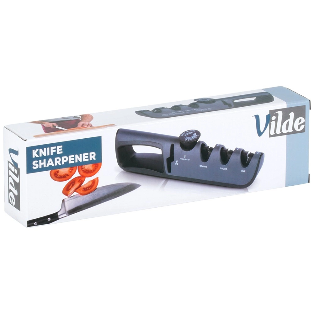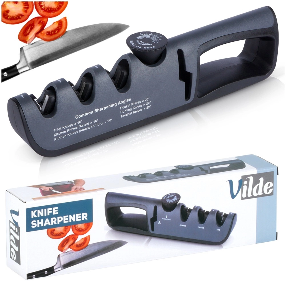 Ta uniwersalna ostrzałka do noży Vilde łączy wygodę domowego ostrzenia z precyzją regulowanych kątów. Za pomocą pokrętła łatwo ustawisz właściwy kąt 14–24° w zależności od typu ostrza – od noży kuchennych i filetowych po EDC i noże myśliwskie. Dzięki antypoślizgowej podstawie oraz ergonomicznemu uchwytowi o szerokim chwycie praca jest bezpieczna i stabilna.