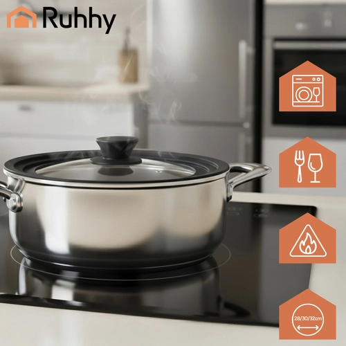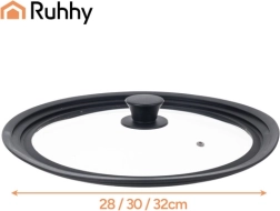 Szukasz jednej pokrywki do różnych naczyń? Uniwersalna pokrywka RUHHY 3 w 1 dzięki trzem stopniom osadzenia pasuje do średnic 28 / 30 / 32 cm. Silikonowa krawędź chroni brzegi naczyń przed zarysowaniami i zapewnia doskonałą szczelność, a przezroczyste żaroodporne szkło umożliwia kontrolę gotowania bez podnoszenia pokrywki.