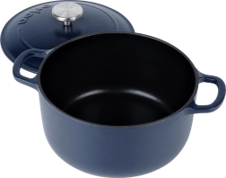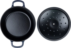 - Design: zewnętrzna ciemnoniebieska, wewnętrzna czarna emalia – praktyczny i elegancki dodatek do gotowania.