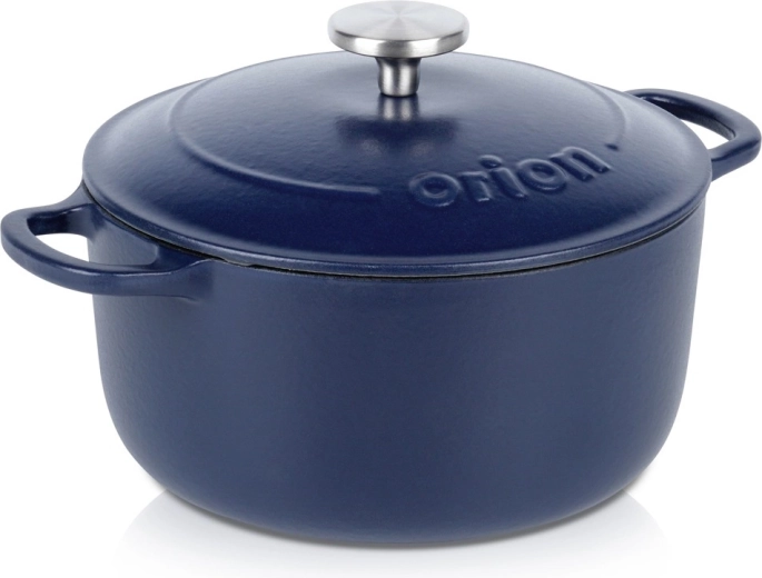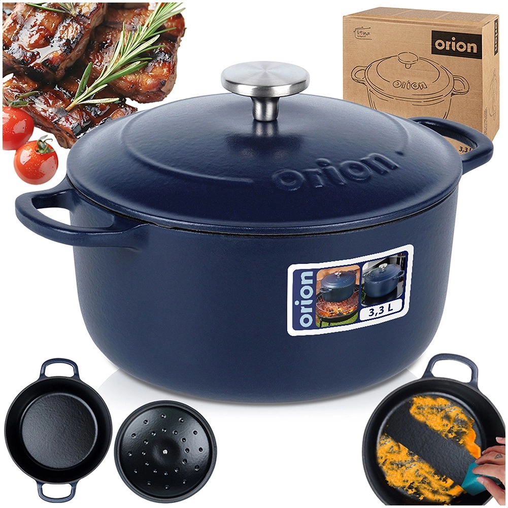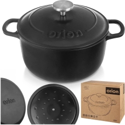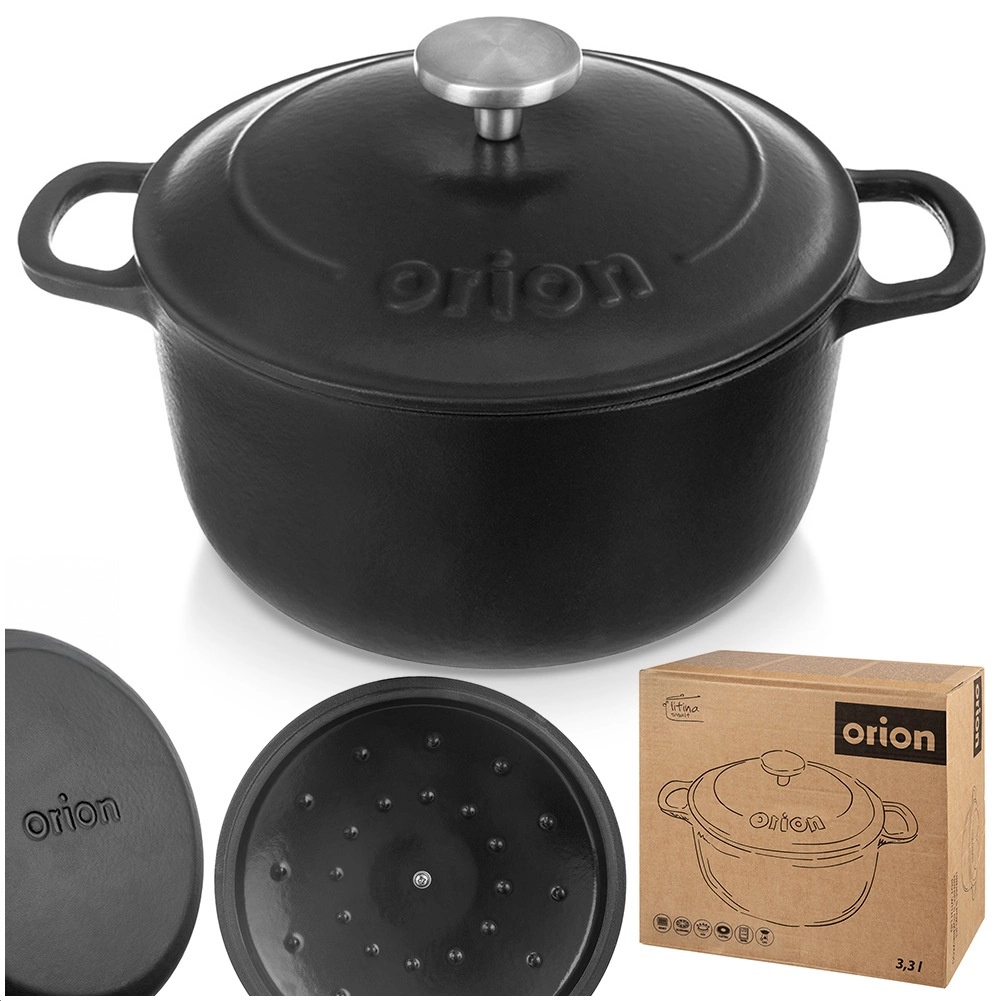 Uniwersalny żeliwny garnek z pokrywką o pojemności 3,3 l do codziennego gotowania i wolnego duszenia. Dzięki równomiernemu rozprowadzaniu ciepła, długiej akumulacji i odporności do 250 °C idealnie sprawdza się do zup, gulaszy i pieczonych mięs. Wewnętrzna emaliowana powłoka ułatwia gotowanie, serwowanie i czyszczenie, a solidne boczne uchwyty oraz stalowy uchwyt w pokrywie zapewniają bezpieczną obsługę. Sprawdzona jakość marki ORION.