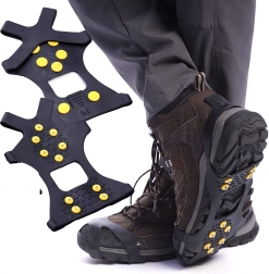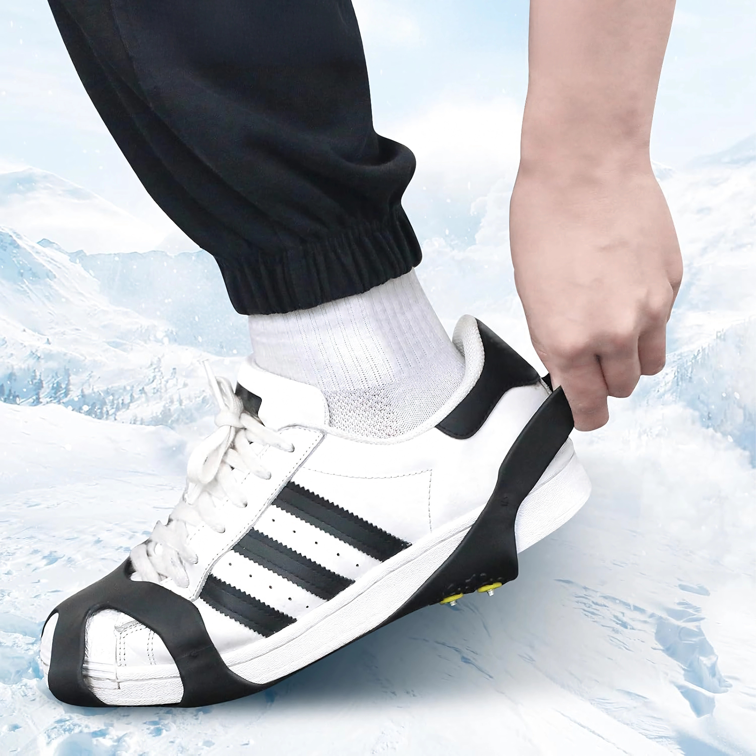 Szukasz prostego sposobu na zwiększenie bezpieczeństwa chodzenia zimą? Te antypoślizgowe nakładki z 10 metalowymi kolcami uzupełniają podeszwę twoich butów o wyraźną trakcję na lodzie, ubitym śniegu i rozmokłej nawierzchni. Mocny, a jednocześnie elastyczny TPE łatwo naciąga się na nos i piętę, trzyma się miejsca i nie zsuwa.