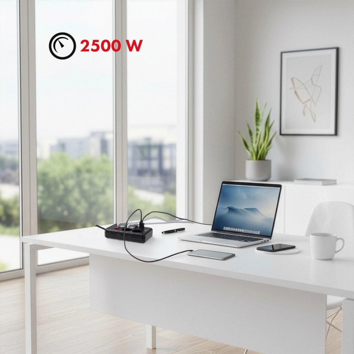 - Wysoka obciążalność do 2500 W dla niezawodnej pracy sprzętów domowych i biurowych.