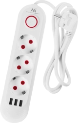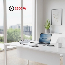 Ta biała listwa zasilająca łączy trzy gniazda sieciowe i trzy porty USB, dzięki czemu bez trudu podłączysz komputer, lampkę i ładowanie telefonu – wszystko w jednym miejscu. Dzięki mocy do 2500 W i solidnej konstrukcji to niezawodny wybór do biurka, sypialni i salonu.