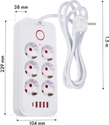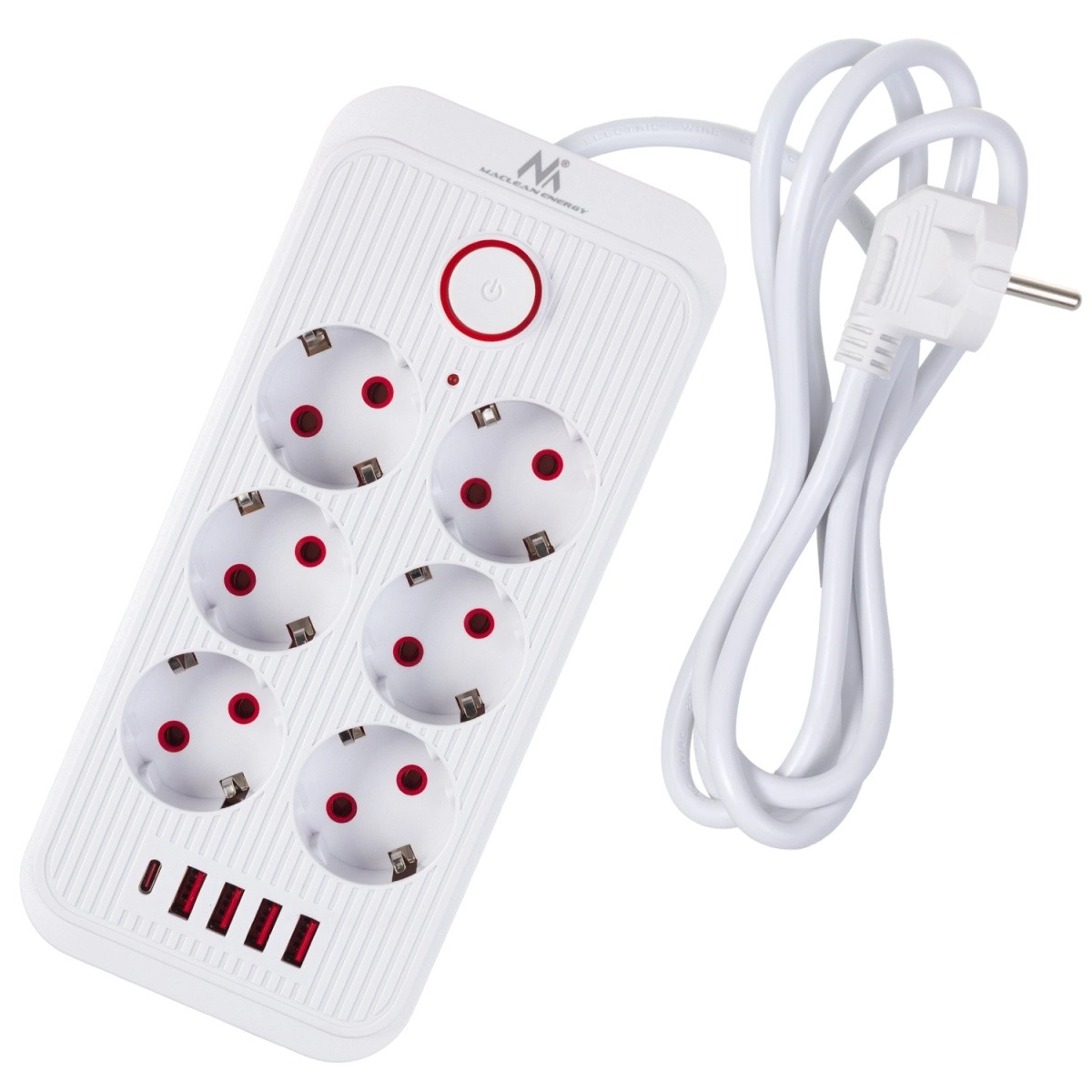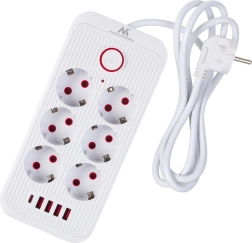 Uniwersalna listwa zasilająca z 6 gniazdami i 5 portami USB (4× USB‑A, 1× USB‑C) do jednoczesnego zasilania i ładowania wielu urządzeń. Zapewnia moc 2500 W, obsługuje 110–240 V / 50–60 Hz i dzięki solidnej konstrukcji idealnie sprawdzi się w biurze, domu oraz w kąciku gamingowym.