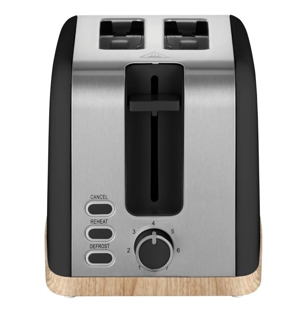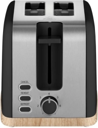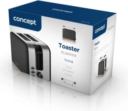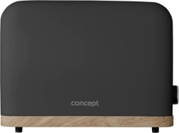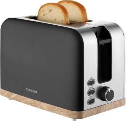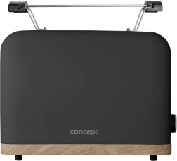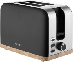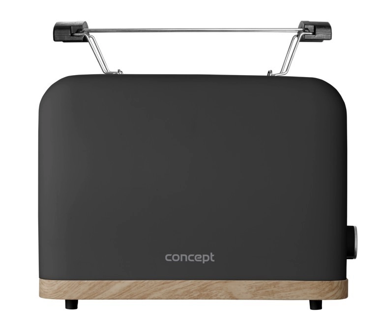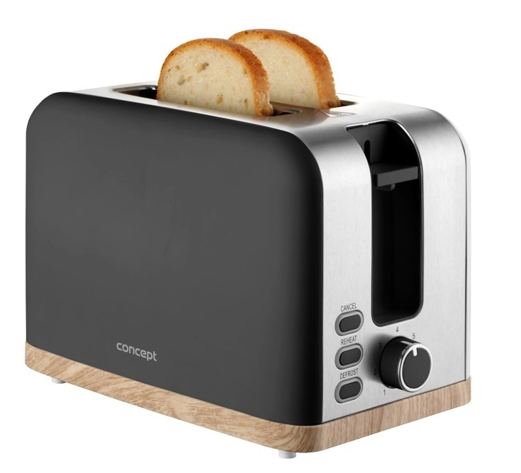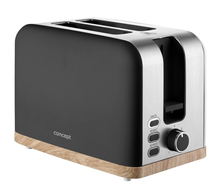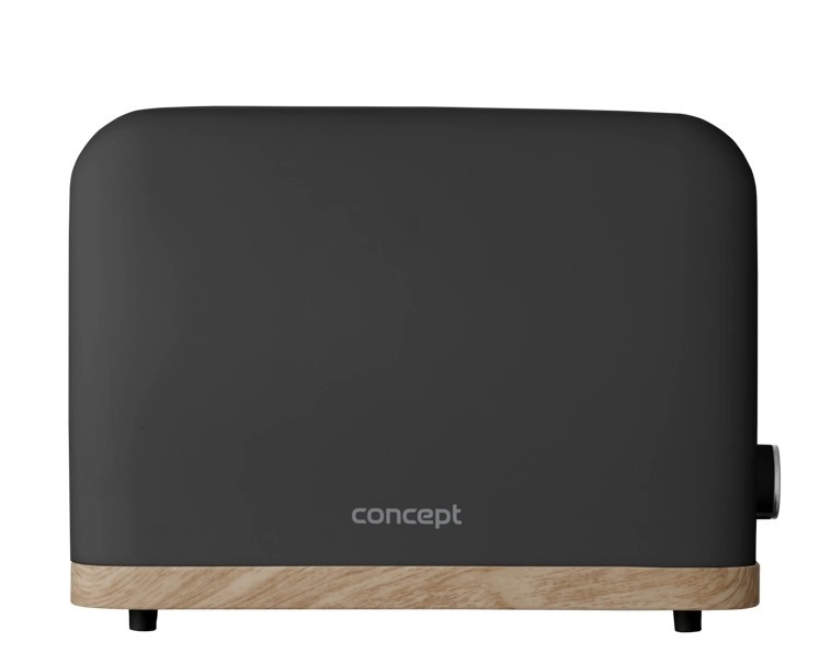 Toster Concept ELWOOD w eleganckiej matowej czerni z drewnianym dekorem zapewnia szybkie przygotowanie chrupiących tostów każdego dnia. Wybierz dokładnie taki efekt, jaki lubisz – od lekko złocistego po wyraźnie chrupiący rezultat dzięki 7 stopniom przyrumienienia. Dwie szerokie szczeliny i automatyczne centrowanie gwarantują równomierne opiekanie z obu stron.