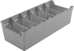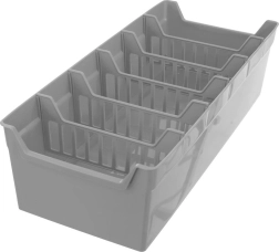 Wysokiej jakości szary plastik jest solidny, a jednocześnie lekki. Otwarta konstrukcja przegródek zapewnia przejrzystość i dobrą cyrkulację powietrza.