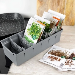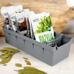 Organizer wykonany jest z wysokiej jakości, wytrzymałego plastiku w eleganckim szarym kolorze. W środku znajdziesz pięć wyjmowanych przegródek, które dzielą przestrzeń na sześć części – łatwo więc zorganizujesz różne rodzaje przypraw i szybko znajdziesz dokładnie to, czego potrzebujesz. Świetny zarówno do zamkniętych, jak i napoczętych torebek.