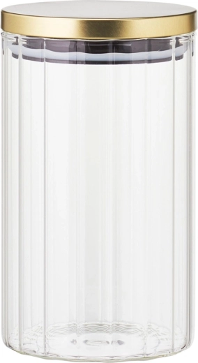 Elegancki i funkcjonalny pojemnik do codziennego przechowywania w kuchni. Przezroczyste szkło borokrzemowe umożliwia natychmiastową kontrolę zawartości, a jednocześnie efektowne wyeksponowanie produktów. Metalowa pokrywka w złotym kolorze z silikonową uszczelką zapewnia hermetyczne zamknięcie i dłuższą świeżość.