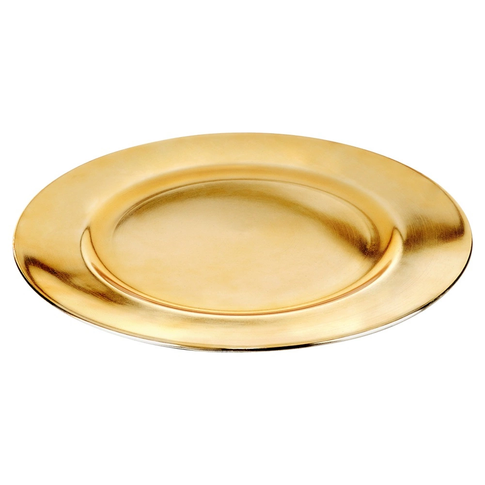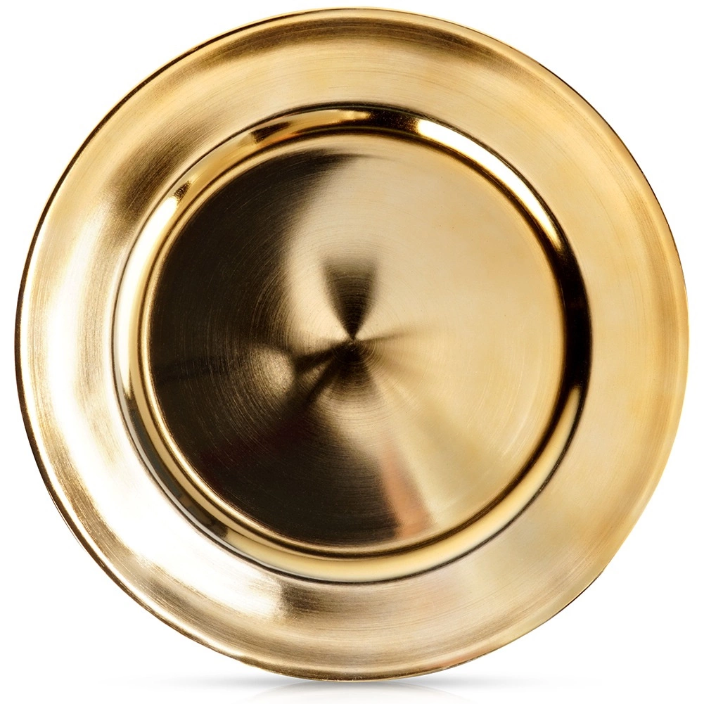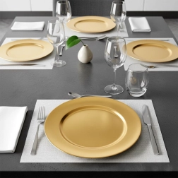 Ten okrągły złoty podkład to stylowa podstawa każdego nakrycia. Szeroki rant i wyrazisty metaliczny połysk natychmiast podnoszą walory talerzy, kieliszków i sztućców, a jednocześnie chronią blat stołu przed ciepłem i plamami. Idealny do codziennego użytku i na specjalne okazje.