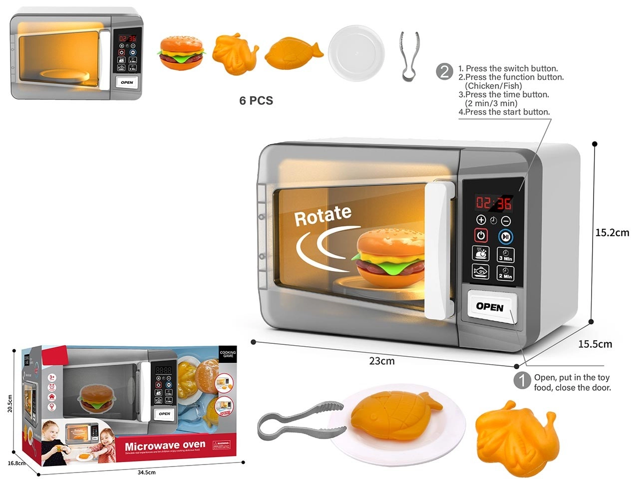Ta dziecięca kuchenka mikrofalowa dostarcza autentycznych wrażeń z gotowania. Po naciśnięciu przycisku START zapala się światło wewnątrz, uruchamia się obrotowy talerz i rozbrzmiewają efekty dźwiękowe, które naśladują prawdziwą pracę urządzenia.