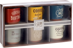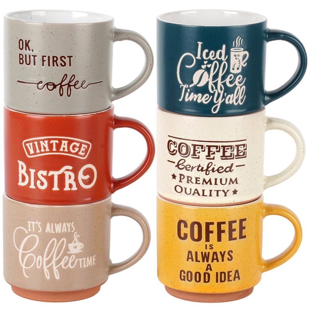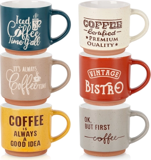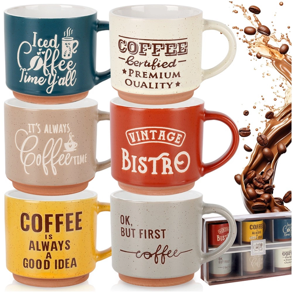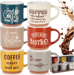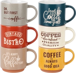 Dekor w postaci kawowych sloganów i zróżnicowanych kolorów doda Twojej kuchni niepowtarzalnego stylu. Kubki są łatwe w utrzymaniu, nadają się do zmywarki, a napój bez obaw podgrzejesz w kuchence mikrofalowej. Dzięki sztaplowanemu kształtowi łatwo je przechowasz i zaoszczędzisz miejsce w szafce.