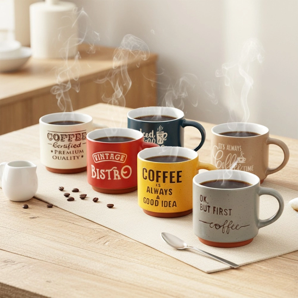 Każdy kubek ma inny kolor i kawowy napis, które ożywią Twój stół i wprowadzą atmosferę ulubionej kawiarni.