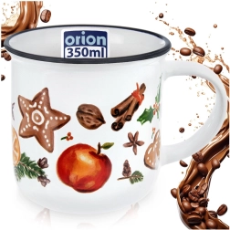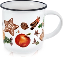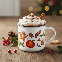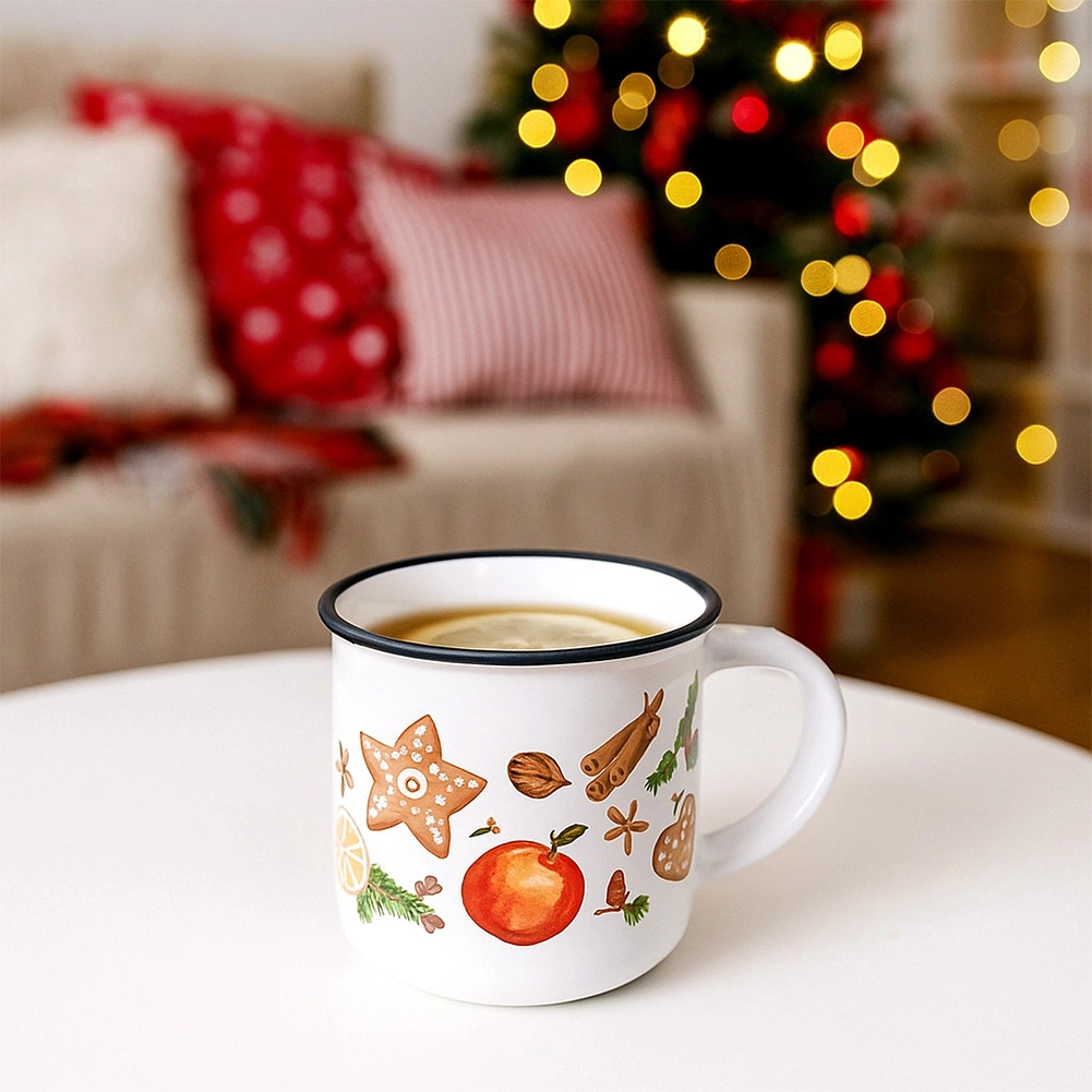 Wprowadź do swojego domu świąteczny nastrój z eleganckim białym kubkiem zdobionym motywami pierniczków, przypraw, owoców i zimowych dekoracji. Czarna krawędź na górnym brzegu podkreśla czysty design i nadaje kubkowi wyjątkowy charakter. Idealny do gorących napojów w chłodne dni.