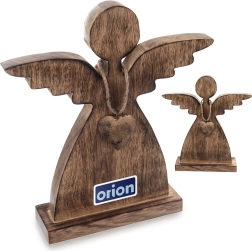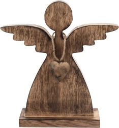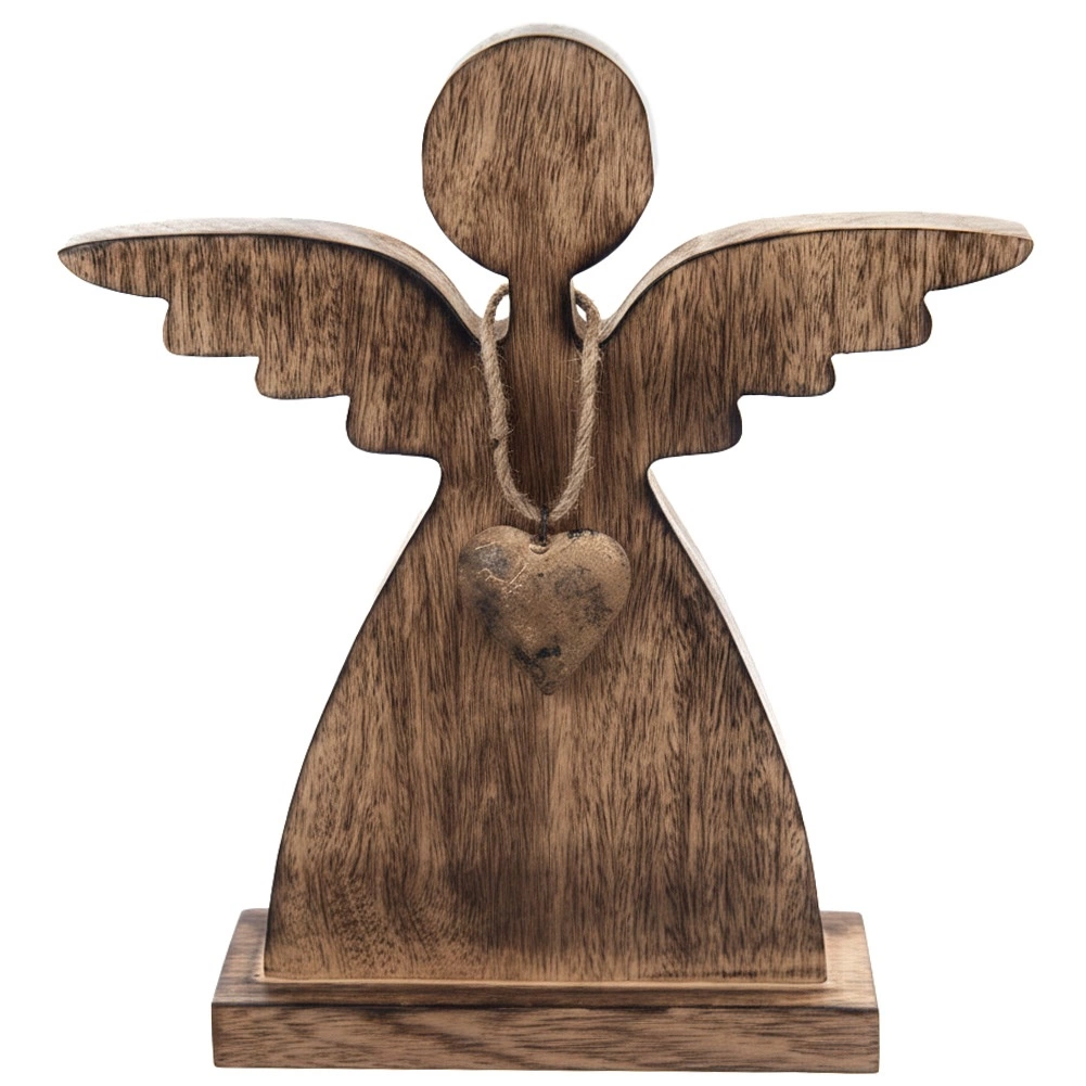 Ten anioł z naturalnego drewna mango wprowadzi do domu spokój i przytulną atmosferę. Minimalistyczne linie, subtelnie stylizowane skrzydła oraz metalowe serduszko w złotym kolorze tworzą ponadczasowe połączenie, które pasuje do nowoczesnych i rustykalnych wnętrz. Stabilna podstawa gwarantuje bezpieczne ustawienie na stole, półce lub komodzie.