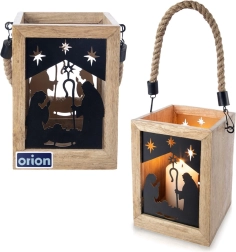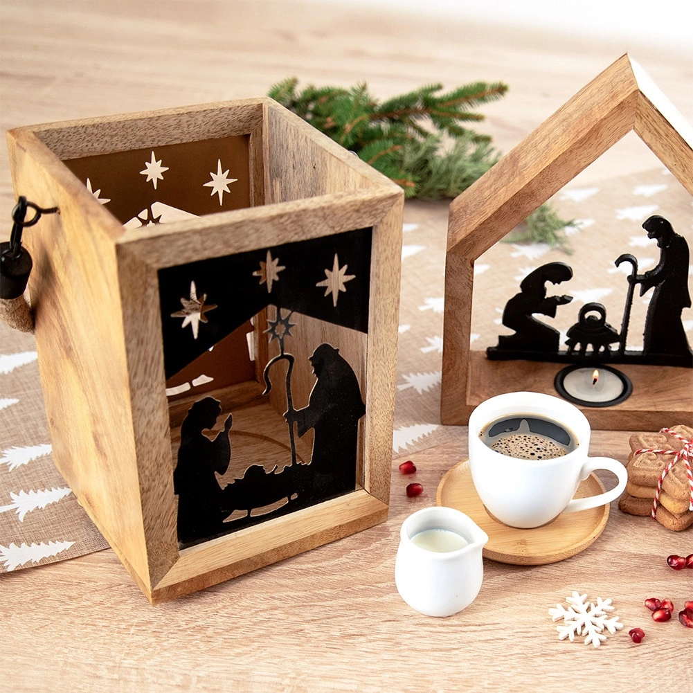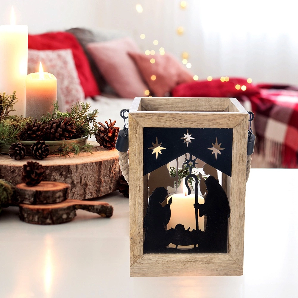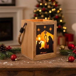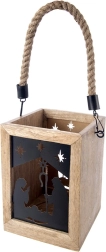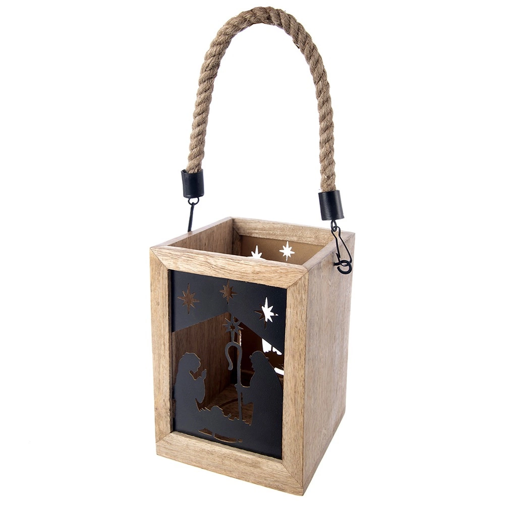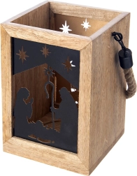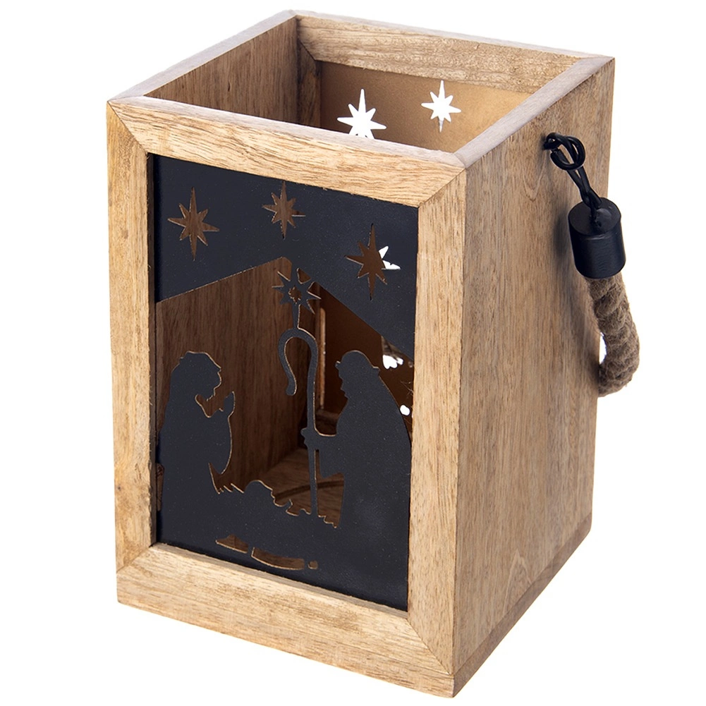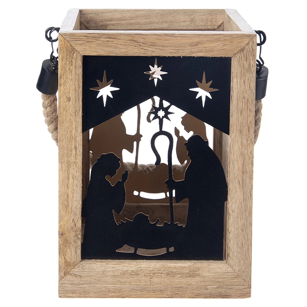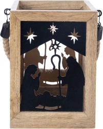 Dodaj domowi magii Świąt dzięki drewnianej latarni z mango o wymiarach 14 × 14 × 20 cm. Czarne metalowe panele z motywem Świętej Rodziny i gwiazd przepuszczają ciepłe światło i tworzą urzekające świetlne projekcje. Latarnię można postawić na komodzie, stole lub podłodze, a także zawiesić dzięki wytrzymałemu, plecionemu sznurowi.
