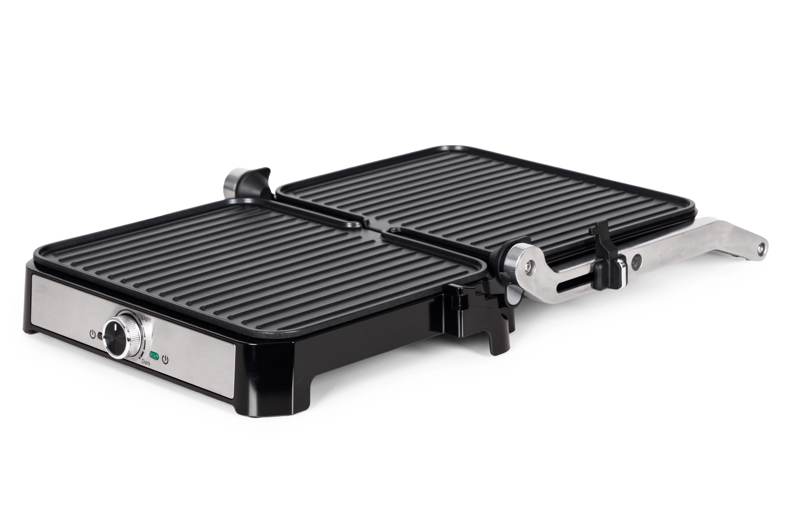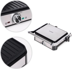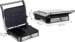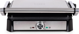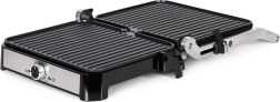 Pokrętło regulacyjne pozwala precyzyjnie ustawić temperaturę do 220 °C, a wskaźniki zasilania i gotowości wskazują właściwy moment na włożenie produktów. W pełni rozkładana pokrywa do 180° zmienia grill w dużą, dwustronną powierzchnię 29,5 × 23 cm, dzięki czemu z łatwością obsłużysz całą rodzinę.