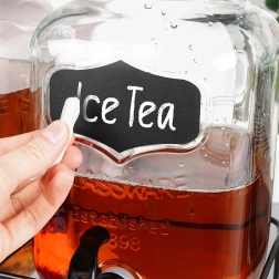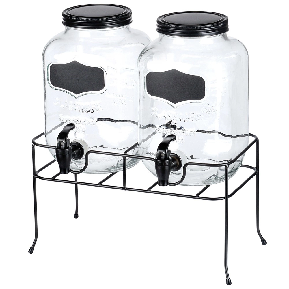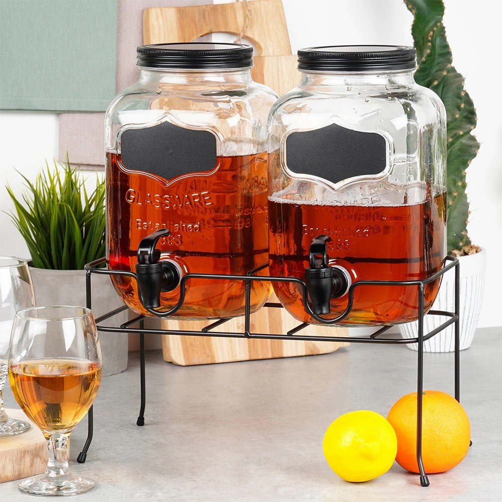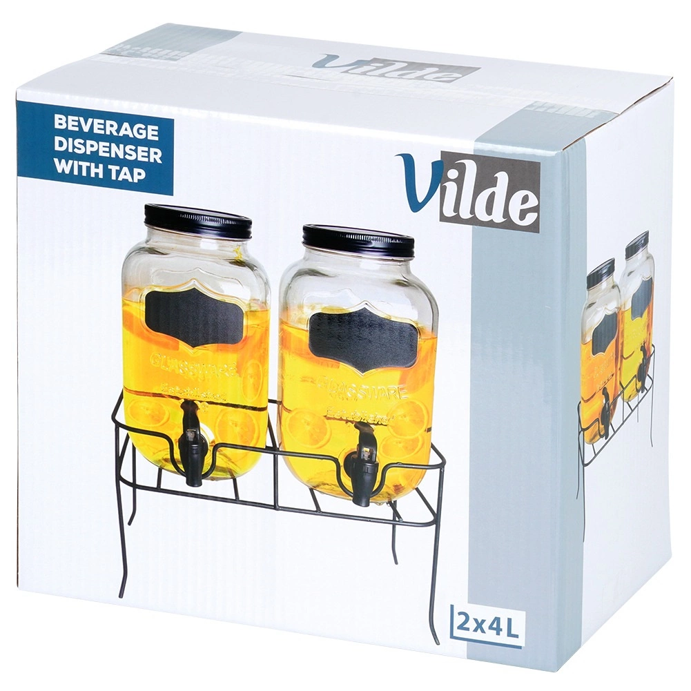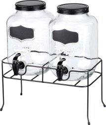 Ten praktyczny zestaw dwóch dyspenserów do napojów wprowadzi porządek i styl do każdego serwowania. Każdy szklany słój ma pojemność 4 l i jest wyposażony w plastikowy kranik z uszczelką dla płynnego nalewania. Dzięki szerokiemu wlewowi napełnianie owocami czy kostkami lodu jest proste, a pokrywka chroni napój przed owadami i zanieczyszczeniami. Tabliczka na froncie pozwala opisać zawartość kredą.