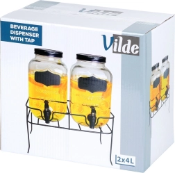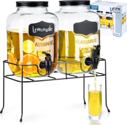 Solidny metalowy stojak w czarnym kolorze zapewnia idealną wysokość do wygodnego nalewania i ma gumowane nóżki zapobiegające przesuwaniu i rysowaniu blatu. Zestaw jest perfekcyjny do lemoniad, soków, mrożonej herbaty, wody smakowej czy ponczu podczas rodzinnych uroczystości, grillów oraz w gastronomii, gdzie umożliwia elegancką prezentację dwóch różnych napojów.