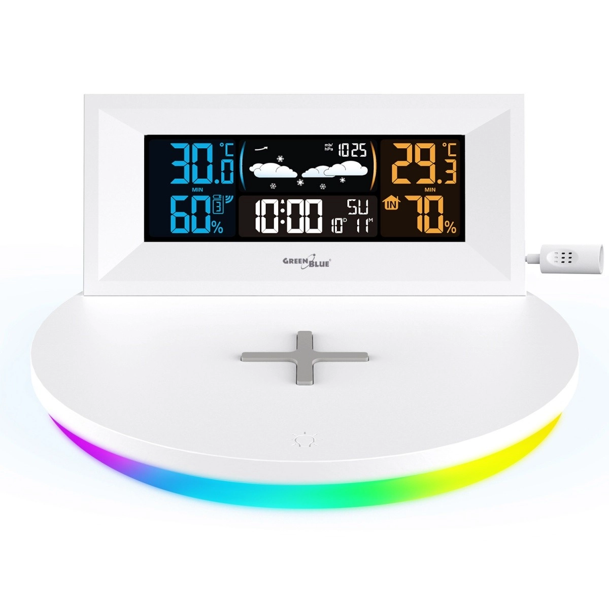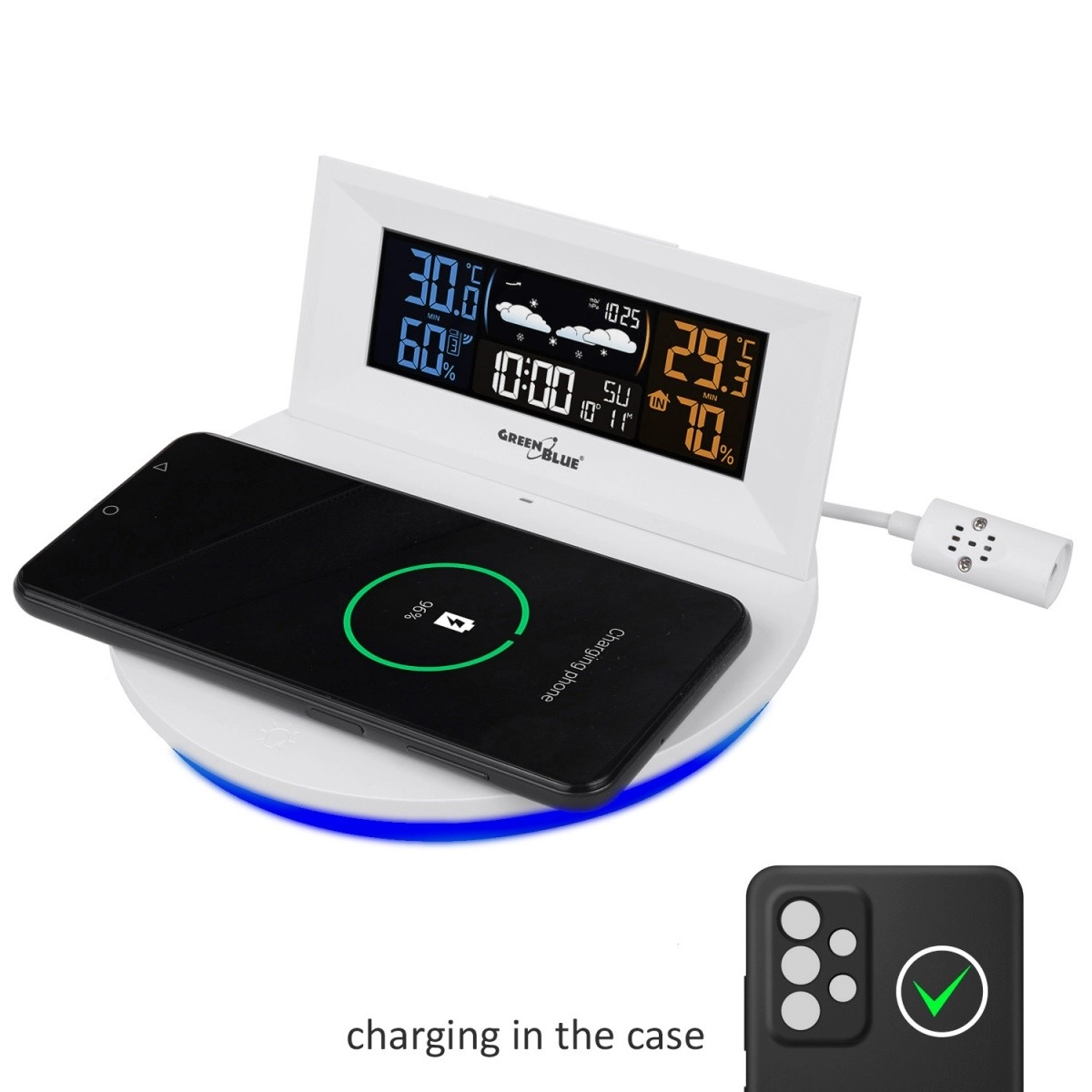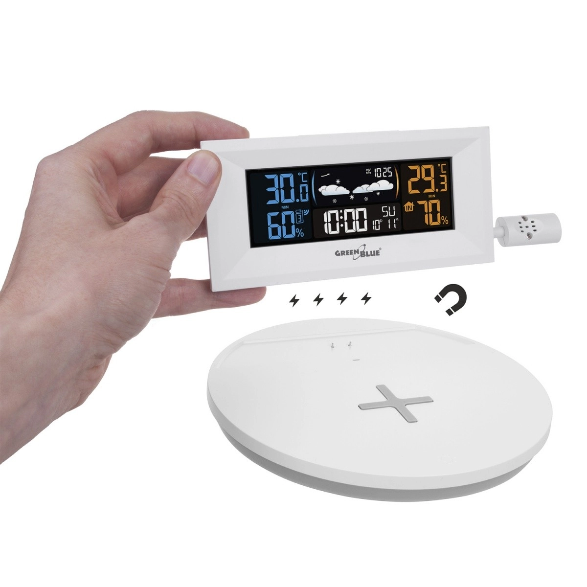 Nowoczesna domowa stacja pogodowa GREENBLUE GB213 łączy precyzyjny pomiar pogody z praktycznym ładowaniem telefonu. Oferuje bezprzewodowe ładowanie Qi, kolorowy wyświetlacz LCD, zewnętrzny bezprzewodowy czujnik oraz zegar z budzikiem i kalendarzem. Dzięki czytelnemu wyświetlaniu temperatury, wilgotności, ciśnienia oraz graficznej prognozy masz podgląd warunków w domu i na zewnątrz, a telefon wygodnie doładujesz bezpośrednio z podstawy.
