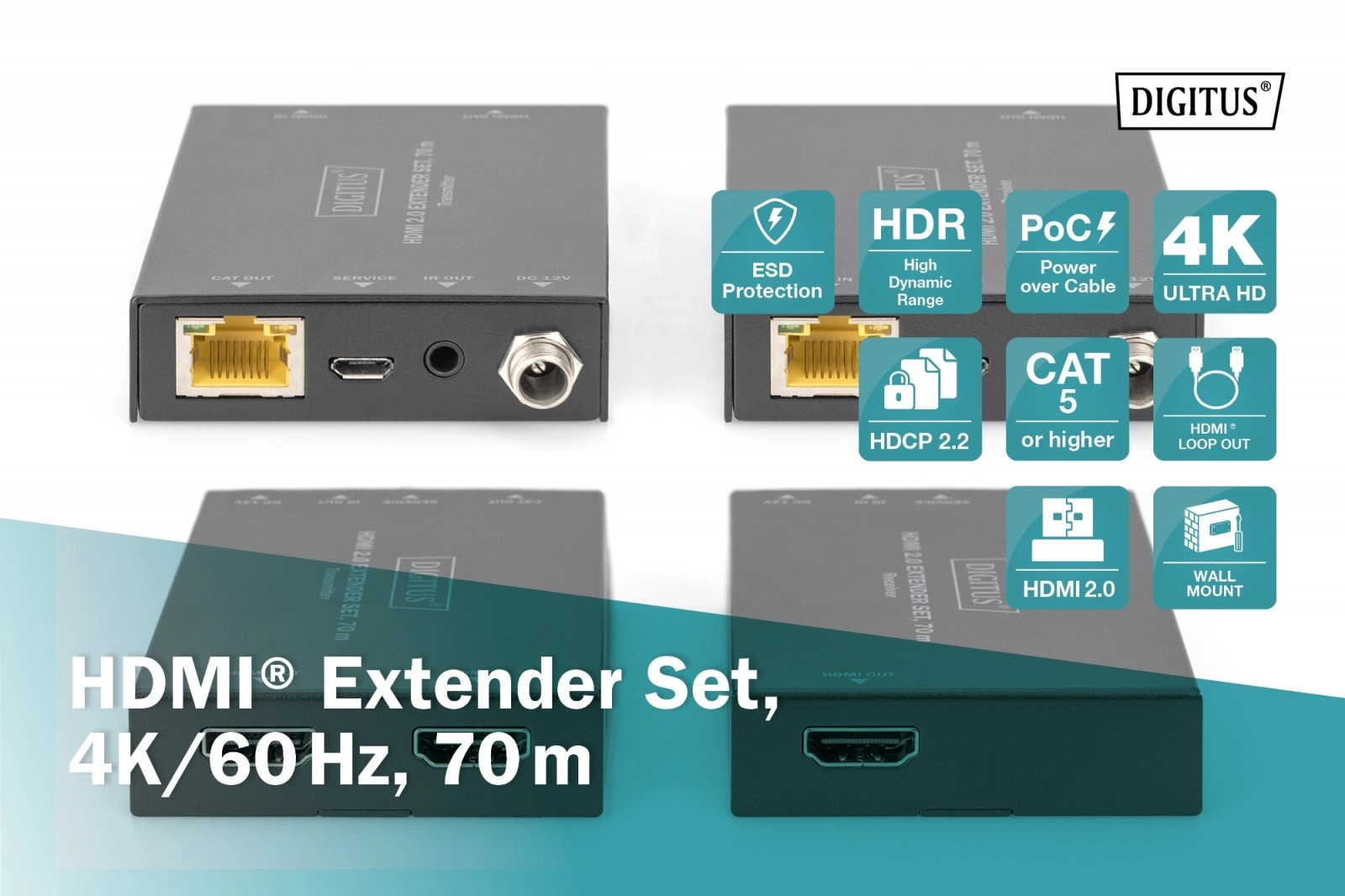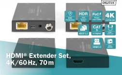 Profesjonalny extender HDMI umożliwia przesył obrazu na odległość do 70 m przez kabel CAT z obsługą 4K 60 Hz (4:4:4), HDR oraz funkcji PoC (Power over Cable), dzięki której zasilanie wystarczy tylko dla jednej jednostki. Oferuje przepustowość wideo 18 Gbps, automatyczne wykrywanie EDID oraz HDMI Loop-Out dla lokalnego monitora.