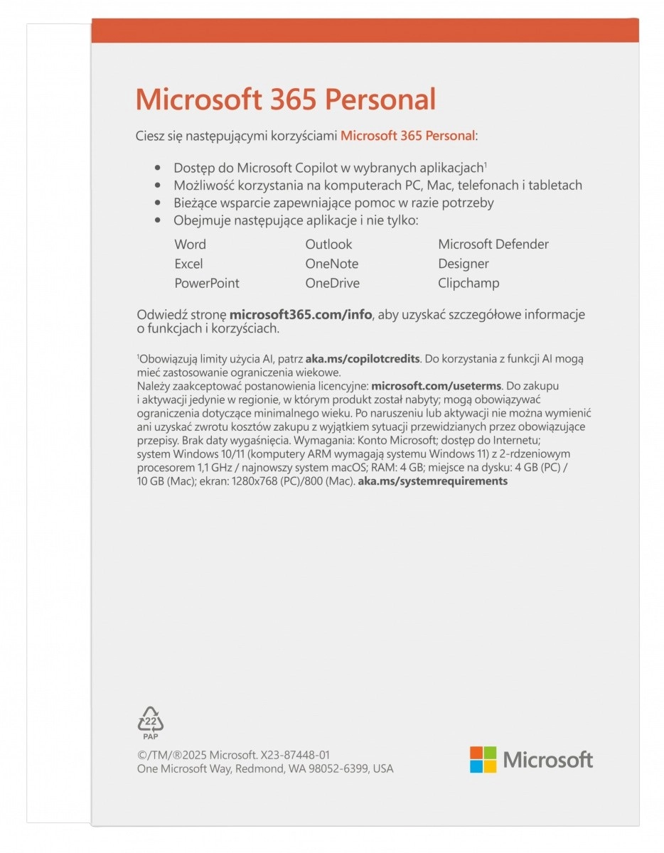 Maksymalnie zwiększ swoją osobistą produktywność dzięki subskrypcji Microsoft 365 Personal dla 1 użytkownika. Korzystaj jednocześnie na nawet 5 urządzeniach na PC, Mac, iPhone, iPad oraz Android. W pakiecie otrzymujesz 1 TB bezpiecznej chmury OneDrive, aplikacje Word, Excel, PowerPoint, Outlook i OneNote oraz inteligentne funkcje Microsoft Copilot. Skorzystaj także z Microsoft Designer, Clipchamp oraz zaawansowanej ochrony Microsoft Defender.