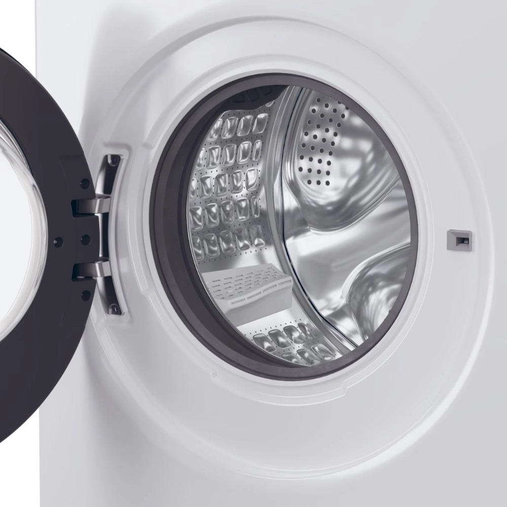 Dzięki praktycznemu szklanemu oknu zawsze masz podgląd przebiegu prania. Cicha praca i liczne tryby oszczędne zapewniają komfort w każdym domu. Eleganckie białe wykończenie z czarną obręczą drzwi łatwo wpasuje się w nowoczesną łazienkę lub pralnię techniczną.
