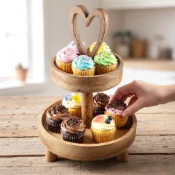 Cała konstrukcja jest z litego drewna mango, które jest naturalnie odporne na wilgoć, nie odkształca się, nie pochłania zapachów i szybko schnie. Praktyczny uchwyt w kształcie serca ułatwia serwowanie, a składana konstrukcja oszczędza miejsce podczas przechowywania i transportu. Doskonała do domu, cateringu i słodkich barów.