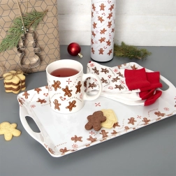 Praktyczna i lekka taca o wymiarach 37,5 × 23 × 2,5 cm ułatwia bezpieczne przenoszenie kawy, herbaty, deserów i drobnych przekąsek. Białą powierzchnię zdobi dekor z pierniczkowymi postaciami, który doda Twojemu serwowaniu odświętnego i zarazem zabawnego charakteru przez cały rok.
