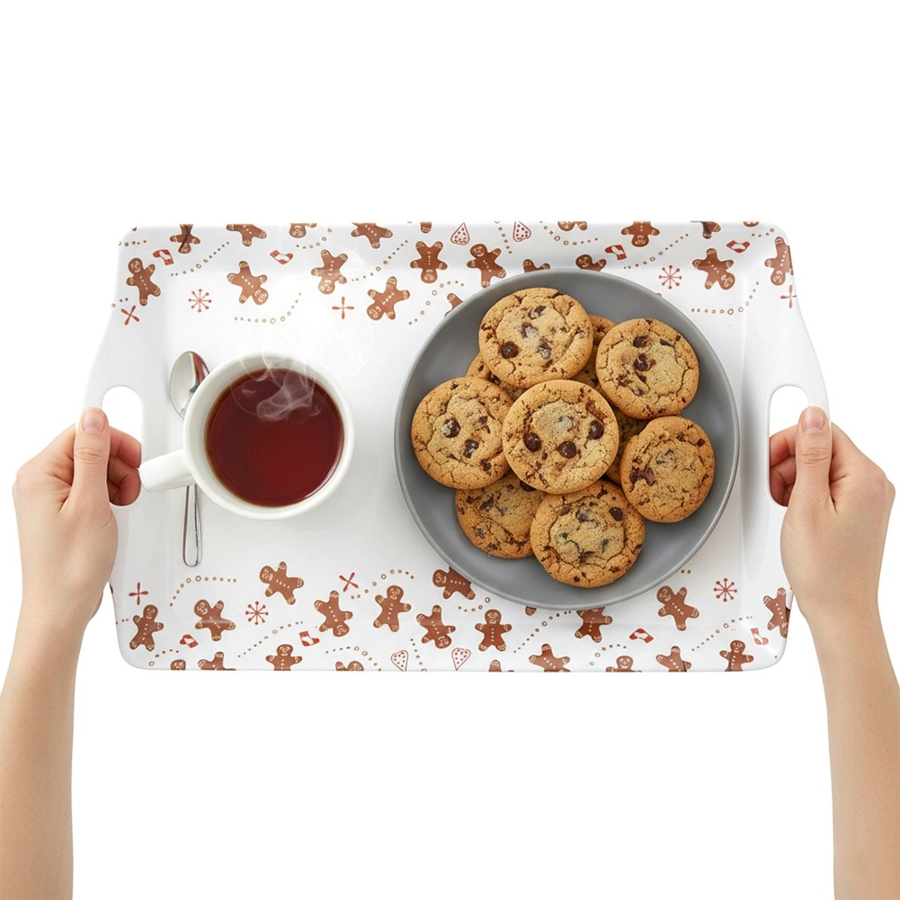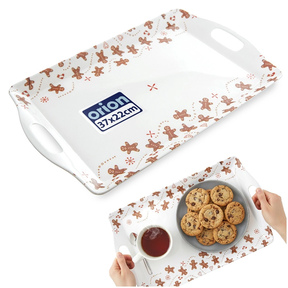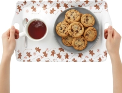 Stylowa prostokątna taca serwingowa z motywem pierniczków jest idealna do podawania napojów, deserów i śniadań. Dzięki zintegrowanym uchwytom, podwyższonemu brzegowi i wytrzymałemu plastiku wygodnie się ją przenosi i łatwo czyści. Świetnie sprawdzi się na świątecznym stole oraz do codziennego użytku w domu i gastronomii.