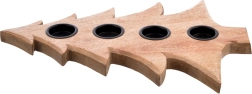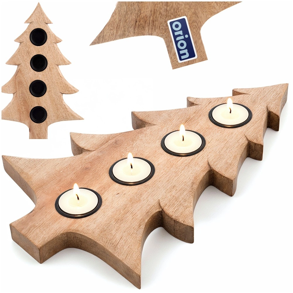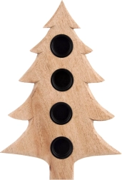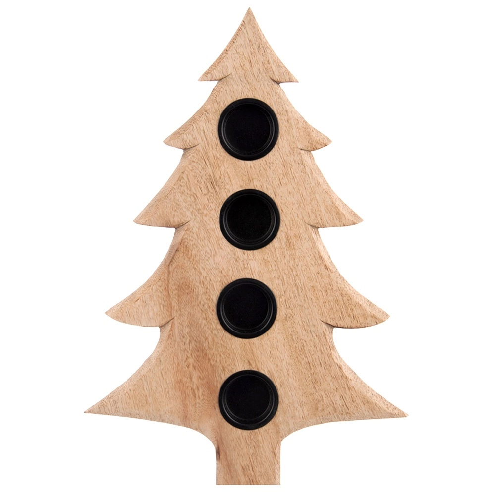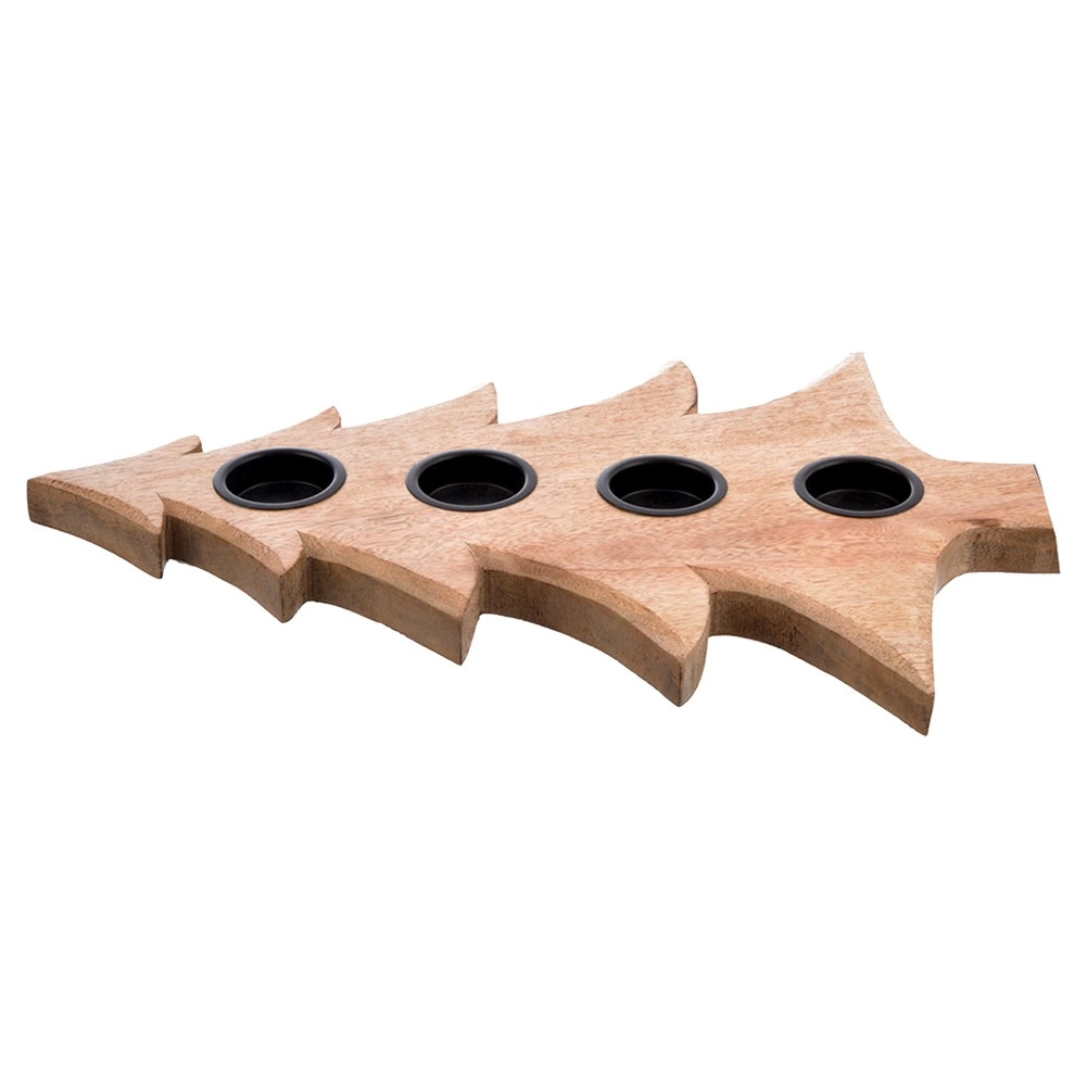 Stwórz w domu przytulną atmosferę dzięki drewnianemu świecznikowi w kształcie choinki. Połączenie drewna mango i czarnych metalowych miseczek na tealighty nadaje dekoracji elegancki wygląd, a jednocześnie gwarantuje bezpieczne użytkowanie. Wymiary 40 × 27,5 × 2,5 cm pozwalają ustawić świecznik na stole, komodzie lub parapecie.