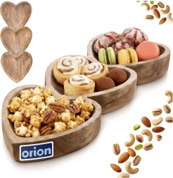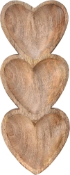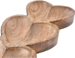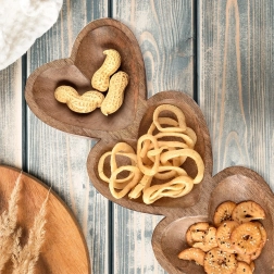 Gustowna podłużna taca o wymiarach 40 × 16 × 3,5 cm oferuje oryginalny design z trzema miseczkami w kształcie serc wykutymi z jednego kawałka. Każde serce ma około 16 × 16 cm, co pozwala na przejrzyste oddzielenie różnych smakołyków – od tapas i sosów po praliny i suszone owoce.