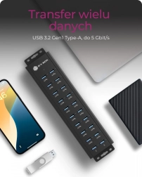 • 20 portów dla maksymalnej produktywności – 18× USB‑A 3.2 Gen 1 do danych + 2× USB‑A do szybkiego ładowania